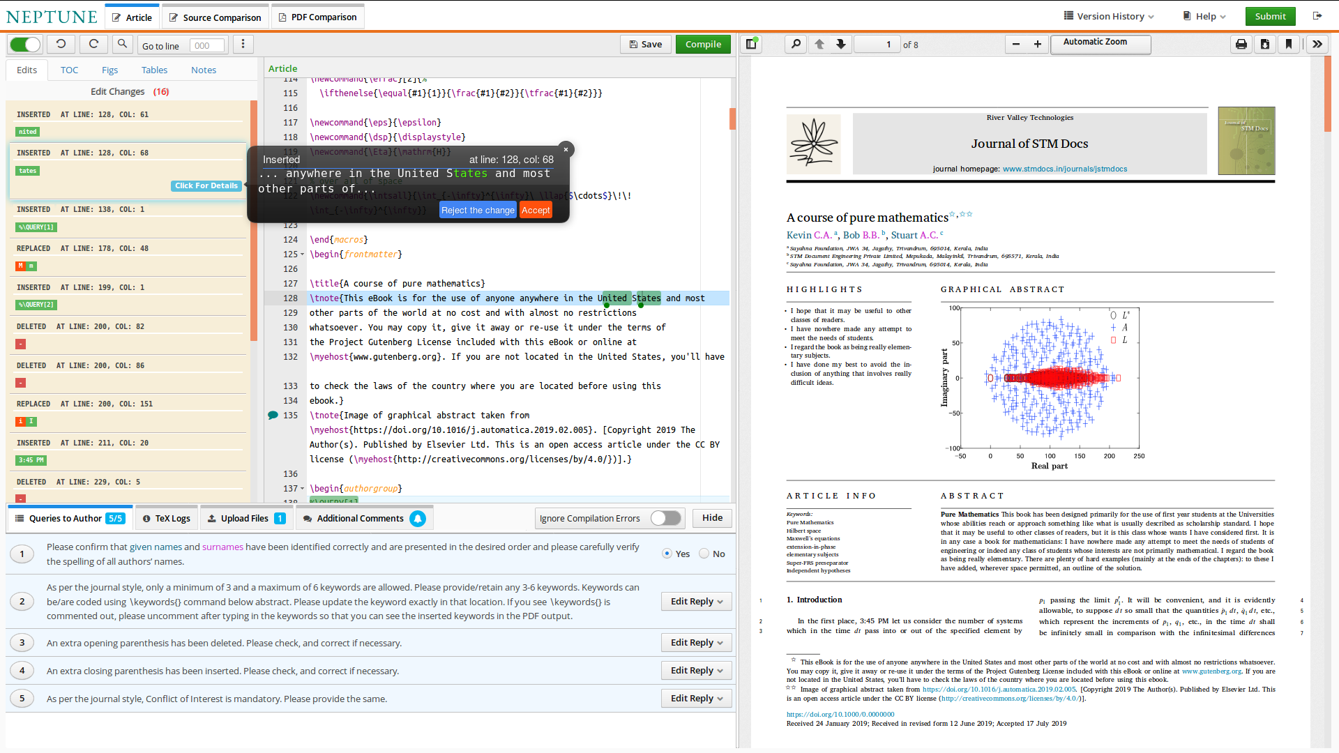 The line/column number of insertion/deletion are also provided. When you click any of the text in the tracker window, a pop-up with the corresponding item will appear with Reject the change and Accept buttons. You can click a button according to your choice. If you don’t do anything, Accept will be applied.